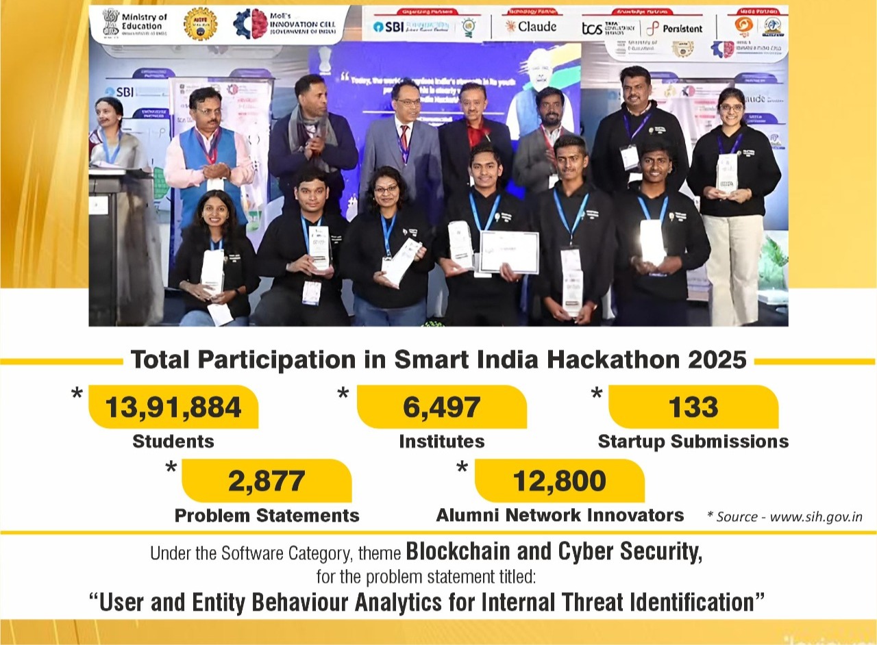 JSPM University, Pune proudly celebrates Team STRAVOS's spectacular victory, securing 1st Rank with a cash prize of ₹1,50,000 at Smart India Hackathon 2025, Bengaluru. Competing against an unprecedented 13,91,884 students from 6,497 institutes nationwide across 2,877 diverse problem statements and 133 startup submissions, our talented team demonstrated exceptional innovation in the Software category under Blockchain and Cyber Security theme. Their groundbreaking solution for "User and Entity Behaviour Analytics for Internal Threat Identification" masterfully integrated blockchain's immutable architecture with advanced AI-driven behavioral analytics to address critical insider threat challenges. This remarkable achievement, recognized by the Ministry of Education and supported by industry giants including Claude AI, State Bank of India, TCS, and Persistent Systems, exemplifies JSPM University's unwavering commitment to nurturing world-class innovators who create impactful technological solutions for national cybersecurity challenges.
